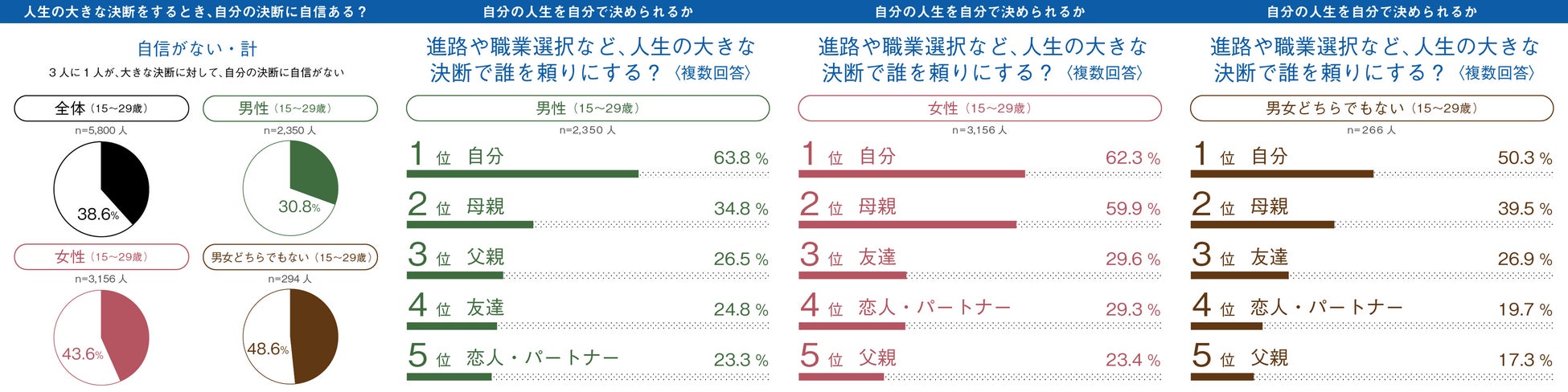 「あなたは、進路や職業選択など、あなたの人生において大きな決断をするときの、自分の決断に自信はありますか。」という質問に対し、「あまりない」「ない」と回答した割合は、女性の4割(43.6%)、男性の3割(30.8%)という結果となりました。大きな決断の際には自分を頼りに決めている若者が6割(62.3%)を超えていますが、一定数の若者はその決断に自信を持っていないことが明らかとなりました。
