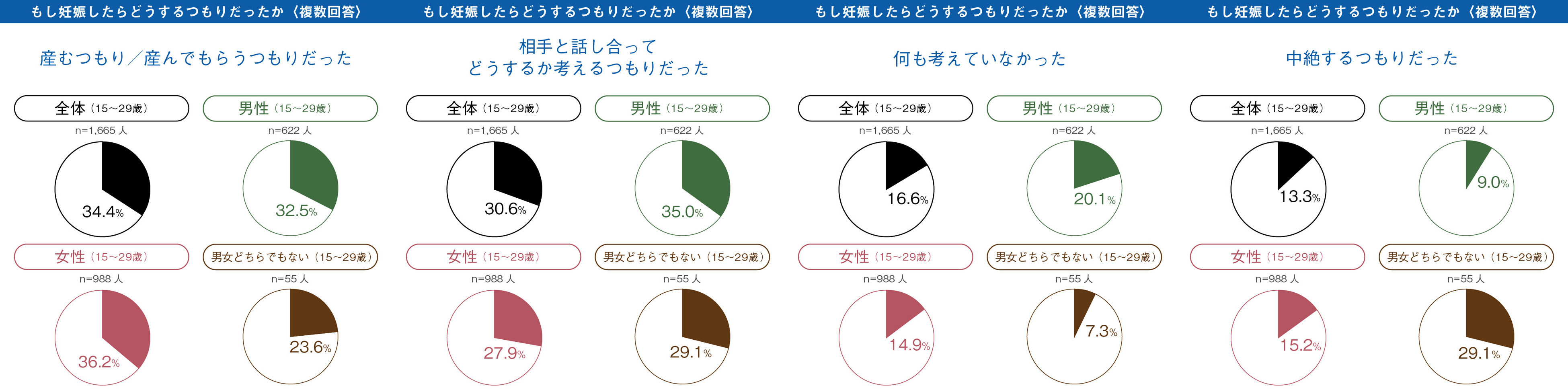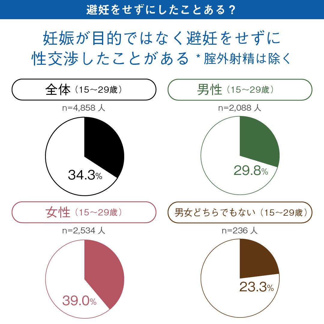 「あなたは、これまでに、妊娠を望まない性交渉において、避妊をしなかったことがありますか。※腟外射精は避妊をしたことに含みません。」という質問に対し、男性は29.8%、女性は39.0%、約3-4割が避妊をしなかった経験があることが分かりました。前回調査よりも避妊をしなかった割合はわずかに増加しています。
