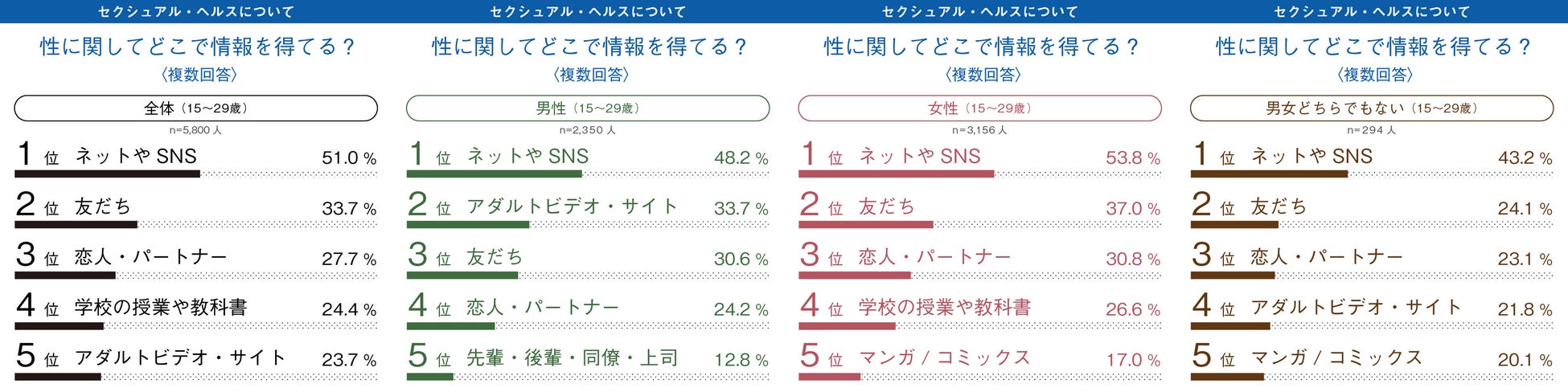 「あなたは、性に関する情報や知識をどこで得ていますか。または、どこで得たことがありますか。〈複数回答〉」という質問に対し、全体の約半数(51.0%)が「ネットやSNS」と回答しました。男性では、「アダルトビデオ・サイト」33.7%「友だち」30.6%、女性では「友だち」37.0、「恋人・パートナー」30.8%の回答が次いで多くありました。
