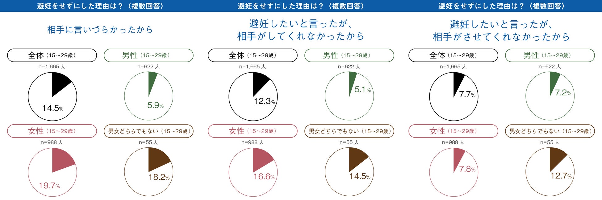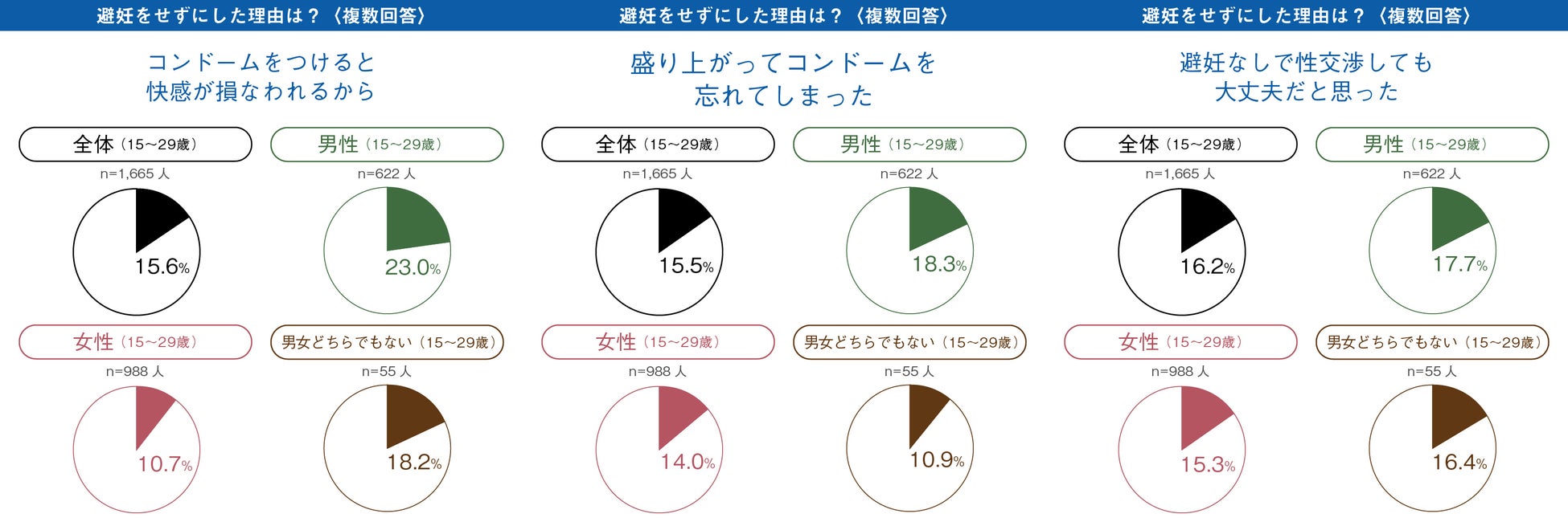 避妊をせずにした理由は、男性では「コンドームをつけると快感が損なわれるから」「盛り上がってコンドームを忘れてしまった」「避妊なしで性交渉しても大丈夫だと思った」、女性では「相手に言いづらかったから」「避妊したいと言ったが、相手がしてくれなかったから」の回答が多くありました。男性は快感を求め避妊をしない一方で、女性は避妊を男性に任せている傾向にあり、相手に言いにくい・言っても相手がしてくれない現状が明らかになりました。これは2021年発表の調査と同様の結果でした。