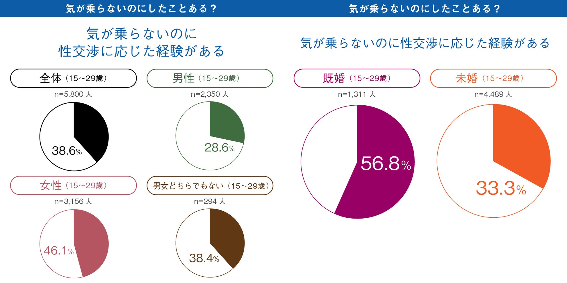 そして、上の画像は2019年、2021年に続き2023年も、男女差が大きかった質問の1つ。気が乗らないのに性交渉に応じた経験率は、男性28.6%、女性46.1%と、女性の方が高い結果が出ました。さらに既婚、未婚で見ると男女ともに既婚者の方が、気が乗らないのに性交渉に応じた割合が高く、既婚者は2人に1人が同意のないセックスをした経験があることがわかりました。