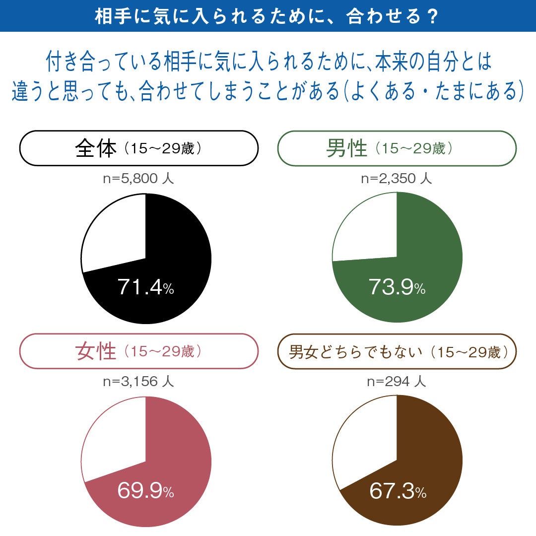 「あなたは、付き合っている相手に気に入られるために、本来の自分とは違うと思っても、相手に合わせてしまうことがありますか。」という質問には、「よくある/たまにある」と答えた人が若者(15-29歳)全体で71.4%、男性73.9%、女性69.9%、男女どちらでもない67.3%であり、性別を問わず、相手に意見を合わせる傾向が見えてきました。
