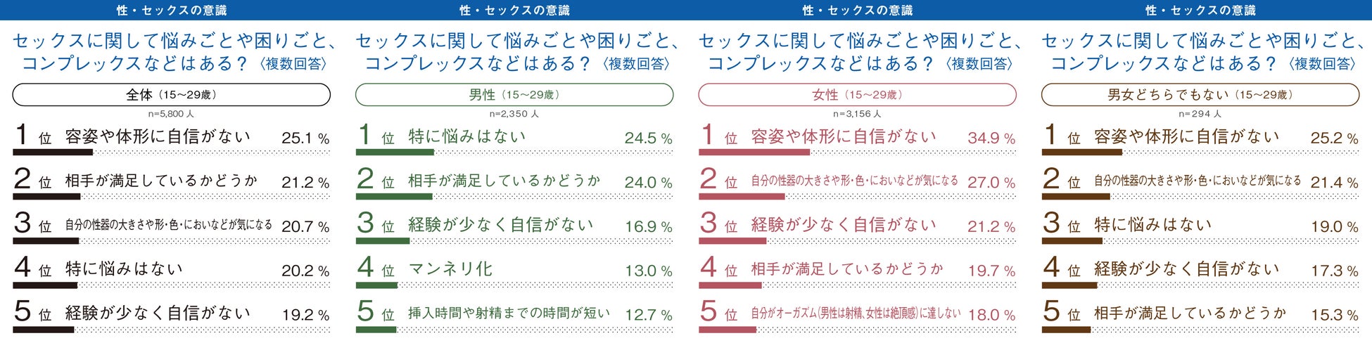 2023年では、全体の4分の3(75%)の人が悩みがあると回答。自分の「容姿や体形」「性器の大きさや形・色・におい」「経験の少なさ」により自信が持てず、「相手が満足しているかどうか」がわからないことが悩みの上位となっていました。女性は年齢が高くなるにつれて自身の快楽が満たされないことが悩みとなっていました。
