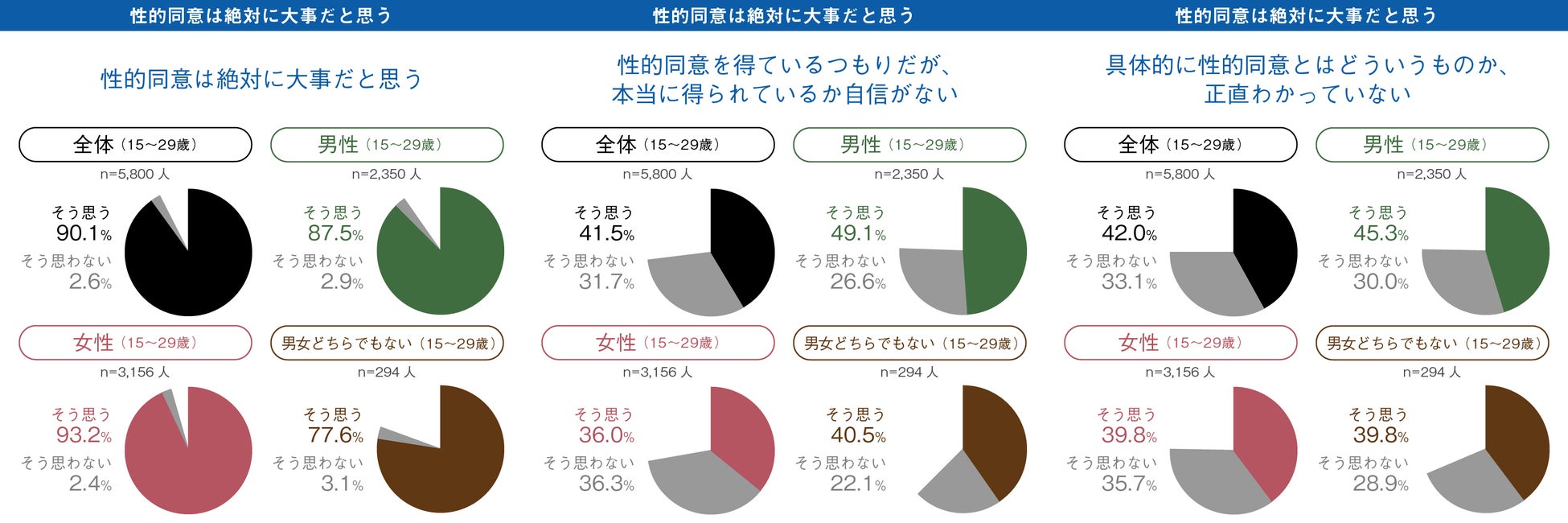 性的同意について「絶対に大事だと思う」若者は9割を超えました(90.1%)。一方で、「性的同意を得ているつもりだが、本当に得られているか自信がない 」と男性の約2人に1人(49.1%)、女性の約3人に1人(36.0%)が回答しました。