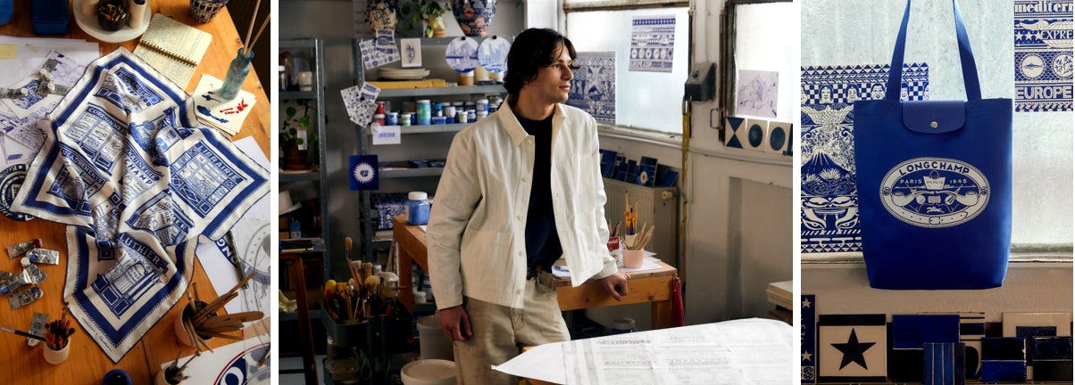 『ロンシャンとの取り組みは、パリの街を歩き回り、地域に根差したアルチザンを探し求める僕の旅を鮮やかに表現しています。僕ははっきりとした色を好むのですが、今回も青と白のツートンカラーがタイポグラフィの遊び心を際立たせています。アルチザンとアーティストとって、指先が紡ぐ美しさを思い出させてくれるはずです』(コンスタンタン・リアン)