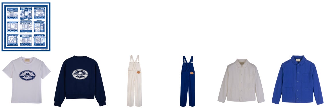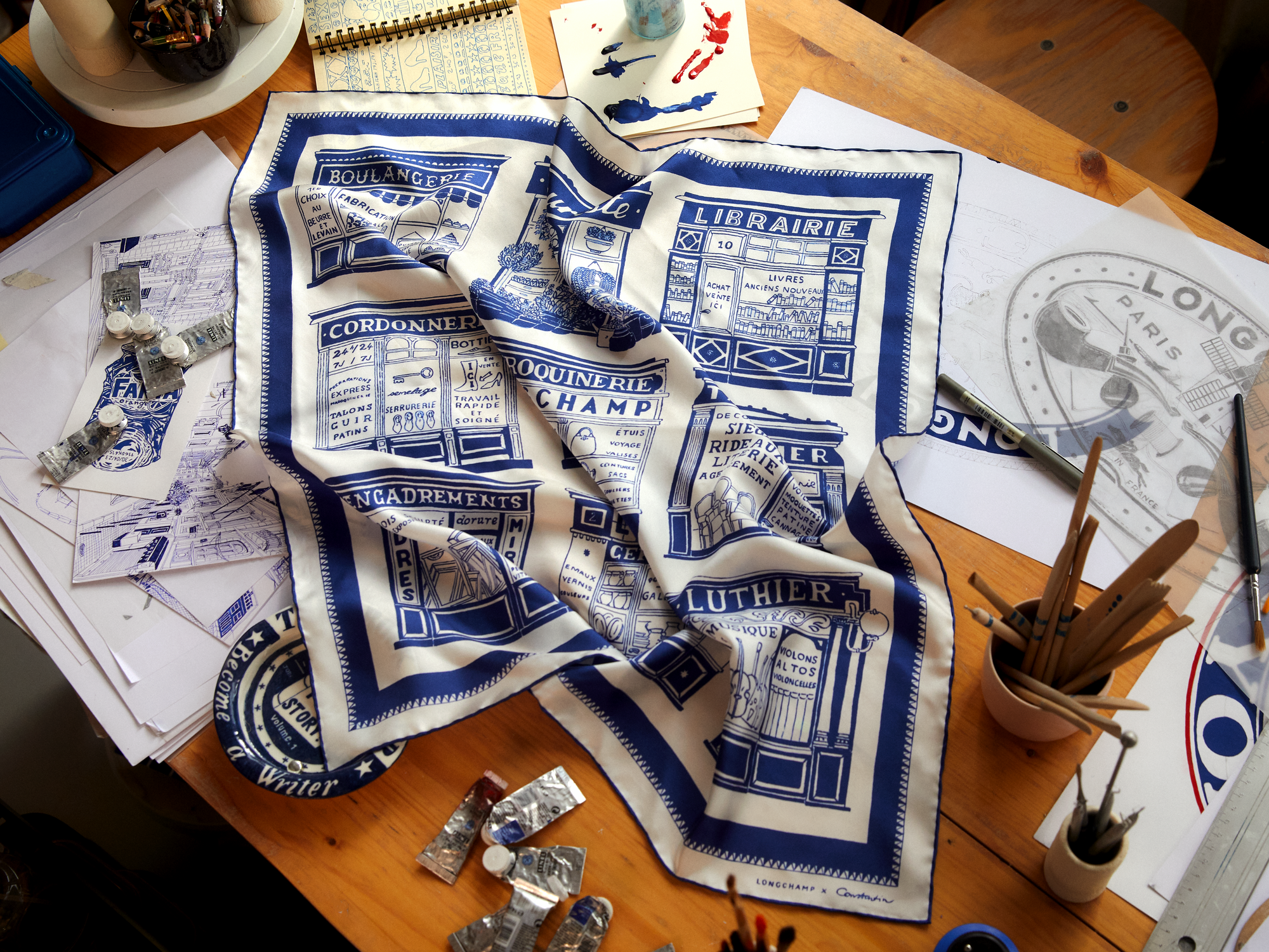 カプセルコレクション「ロンシャン x コンスタンタン」では、メゾンの進化し続けるサヴォアフェール、そしてその継承へのオマージュとして、新たなエンブレムを制作いたしました。革職人に欠かせない道具、創業当時の革巻きパイプ、アイコニックな「ル プリアージュ®」、針と糸、そして旅の魅力を想起させる飛行機と船 - コンスタンタンがロンシャンの真髄を捉え、過去と現在の結びつきを物語る厳選されたコードを描いています。エンブレムは、パリジェンヌの定番「ル プリアージュ® x コンスタンタン」トートバッグを飾り、コットンキャンバス地は時を重ねるごとに独特の風合いを醸し出します。またTシャツやスウェットシャツ、ジャケット、ジャンプスーツにもあしらわれています。飽くなき好奇心と創造性に満ちたコンスタンタンは、観光客のように時間をかけてパリを散策し、何気ない日常に溶け込んだ文字や色彩、建築様式を再発見します。「パリの職人たち」と題したシルクスカーフでは、彼の目を惹きつけた店の佇まいが描かれています。