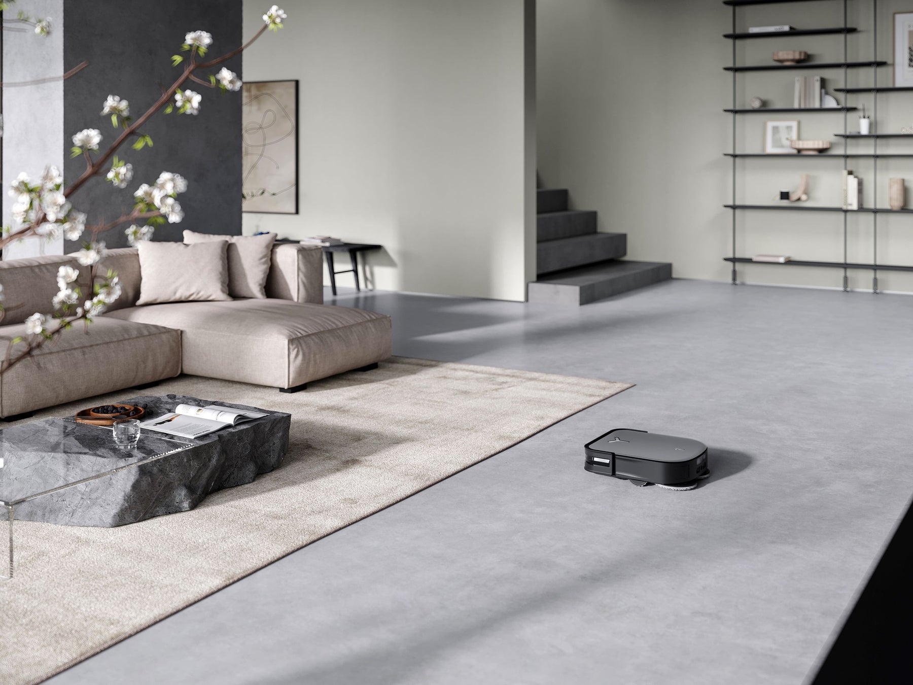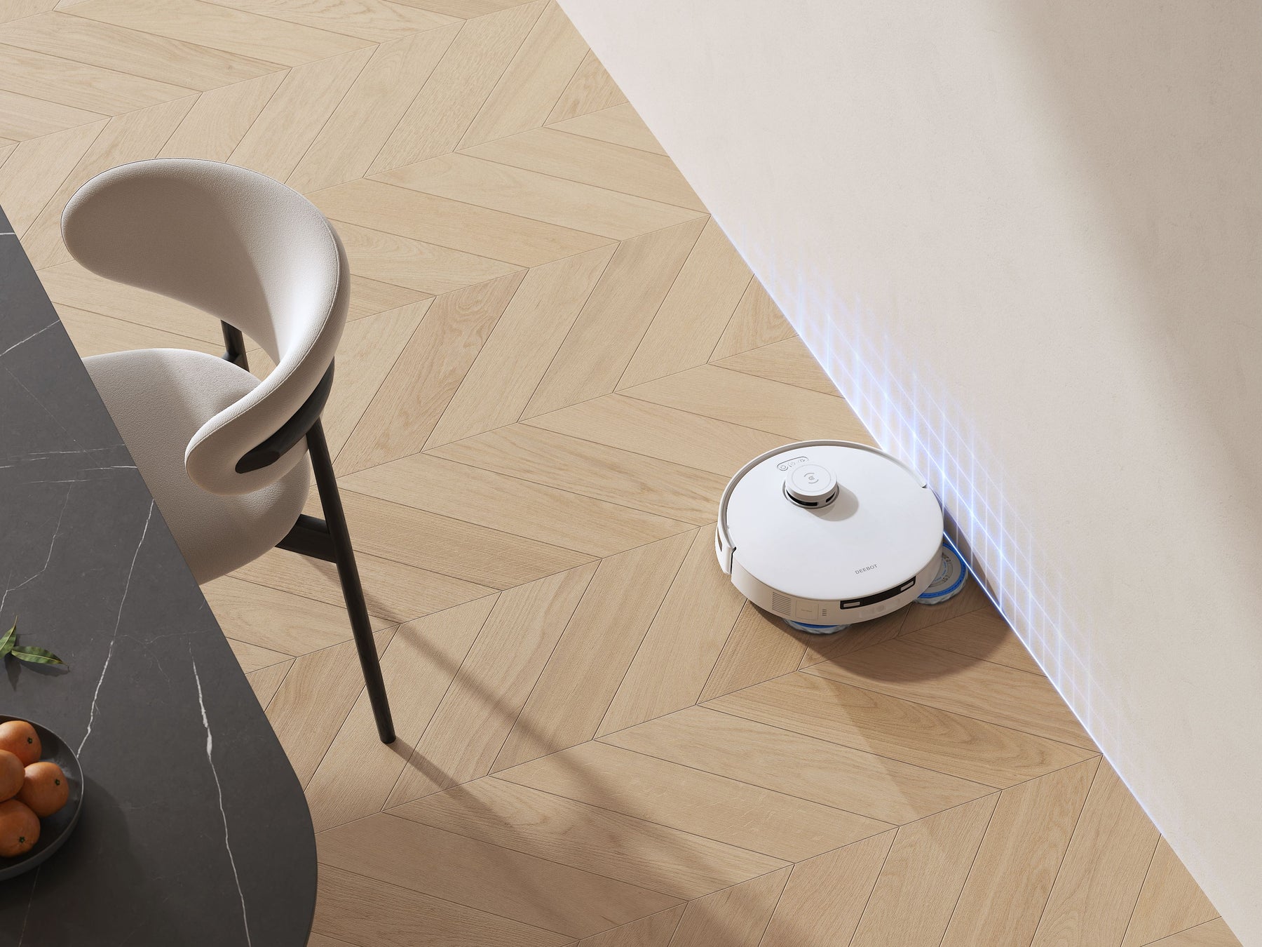 独自の形状:スクエア型、四角く業界最薄9.5㎝のスリムなボディで部屋の隅や角にもフィットし、ソファや家具の下のホコリも取り残さないロボット掃除機。