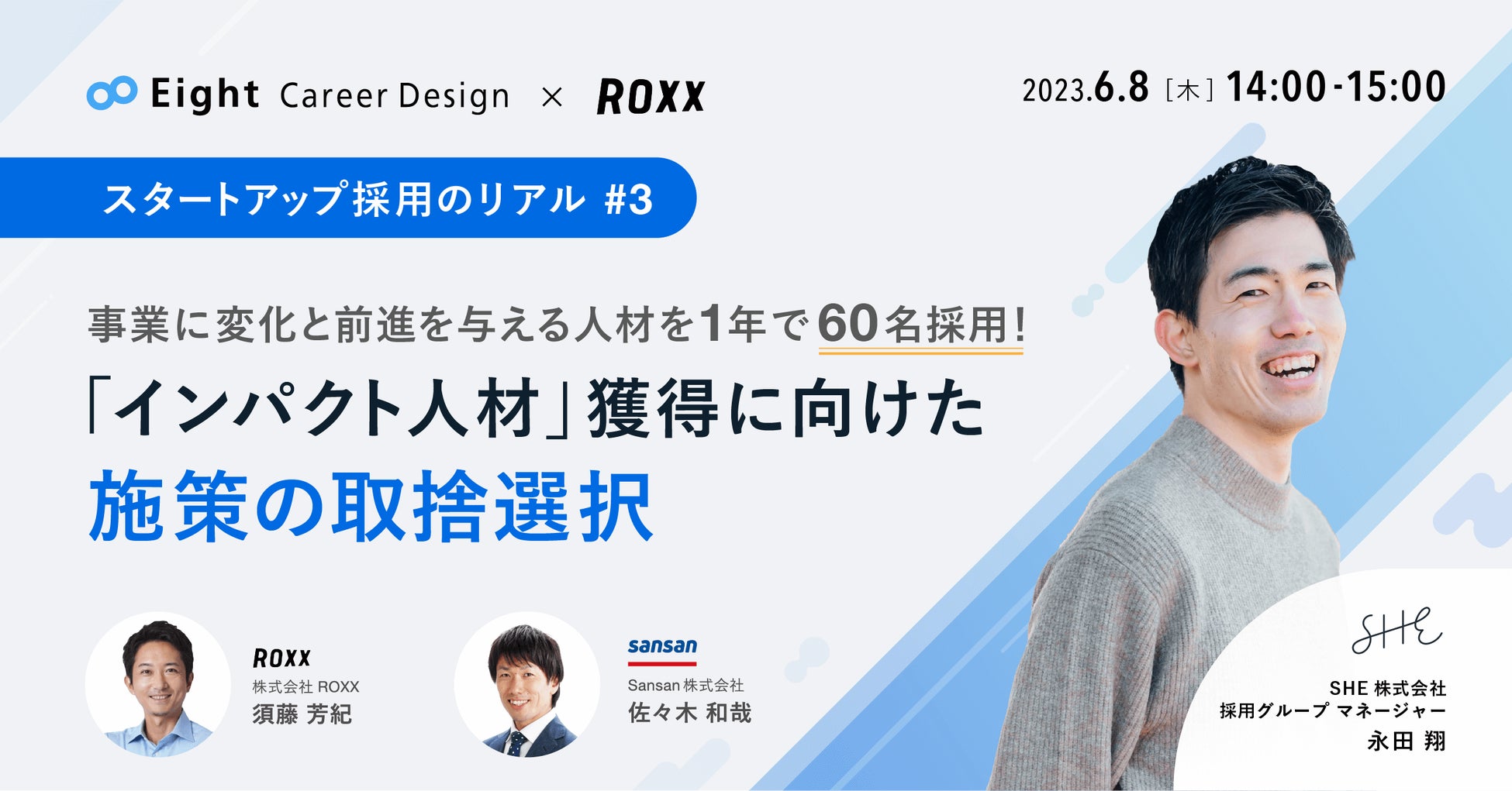 株式会社ROXX(本社:東京都新宿区、代表取締役:中嶋汰朗、以下ROXX)が開発・提供する、オンライン完結型コンプライアンス/リファレンスチェックサービス『back check』は、2023年6月8日、オンラインセミナー「事業に変化と前進を与える人材を1年で60名採用! 『インパクト人材』獲得に向けた施策の取捨選択」を開催いたします。SHE株式会社の採用グループ マネージャーを務める永田翔氏をお招きし、「会社の潮目を変える『インパクト人材』獲得に向けた施策の取捨選択」をテーマに講演いただきます。後半では、モデレーターにSansan株式会社 Eight事業部 Eight Career Design セールス 佐々木和哉氏をお迎えし、弊社 back check事業部 COO 須藤と3名でのパネルディスカッション形式で「現場巻き込み型全社採用のポイント」「自社にとって“インパクト人材"となる人材の要件定義・見極め方法」に着目し、議論を深めます。