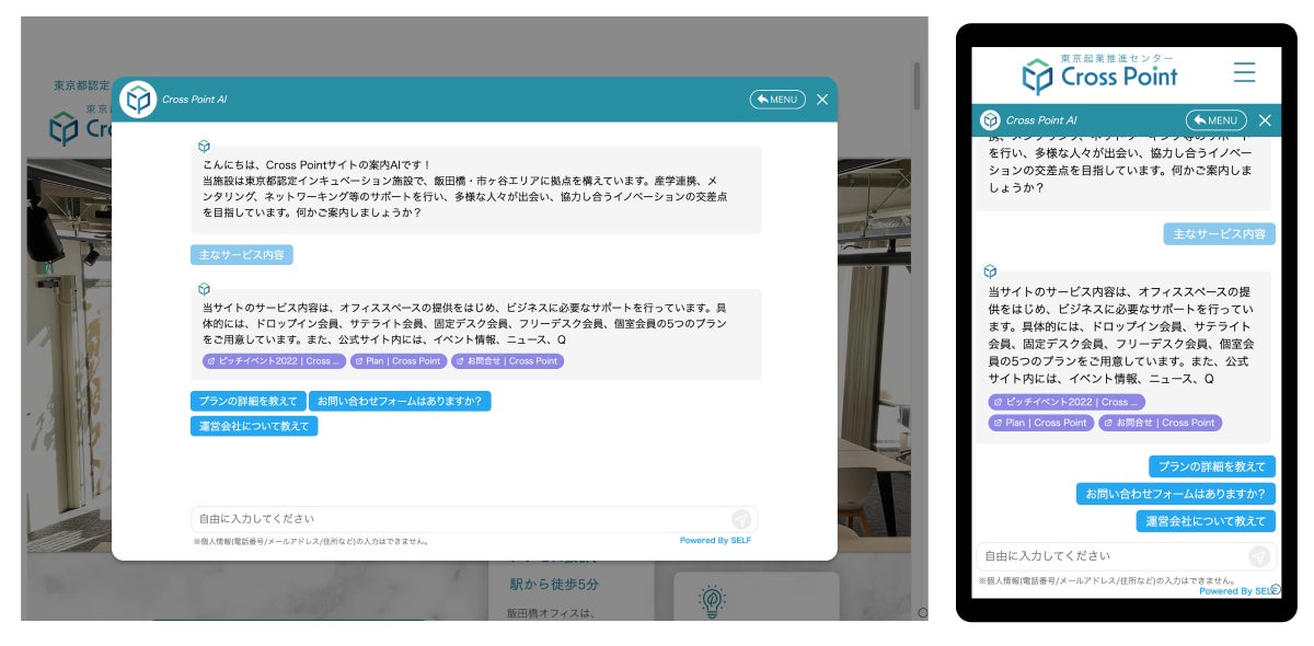 SELF社の提供する会話AIについては、Cross Pointの開業当時からWebサイトに導入し、施設の利用を検討されている方へのクイックな情報提供に寄与していただきました。