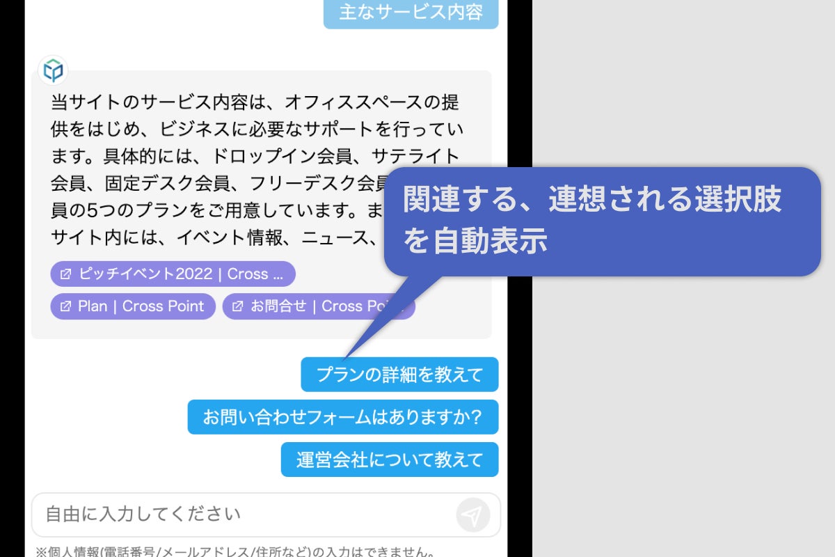 サイトの内容の学習・咀嚼により、単なるFAQ対応ではない「サイト内誘導」という機能も実現しています。ユーザーの課題に応じた的確な回答・提案とサイト内の情報案内による、ユーザー体験・サービスの訴求力向上へつなげます。