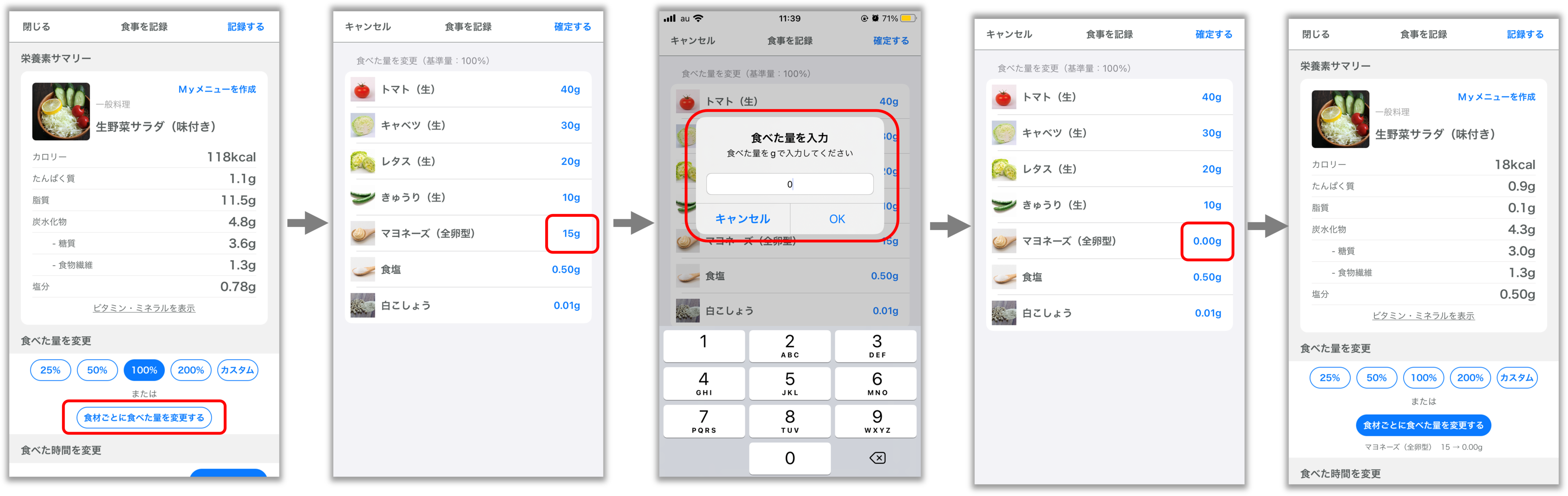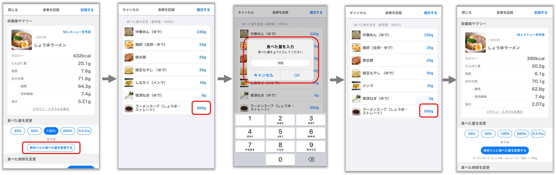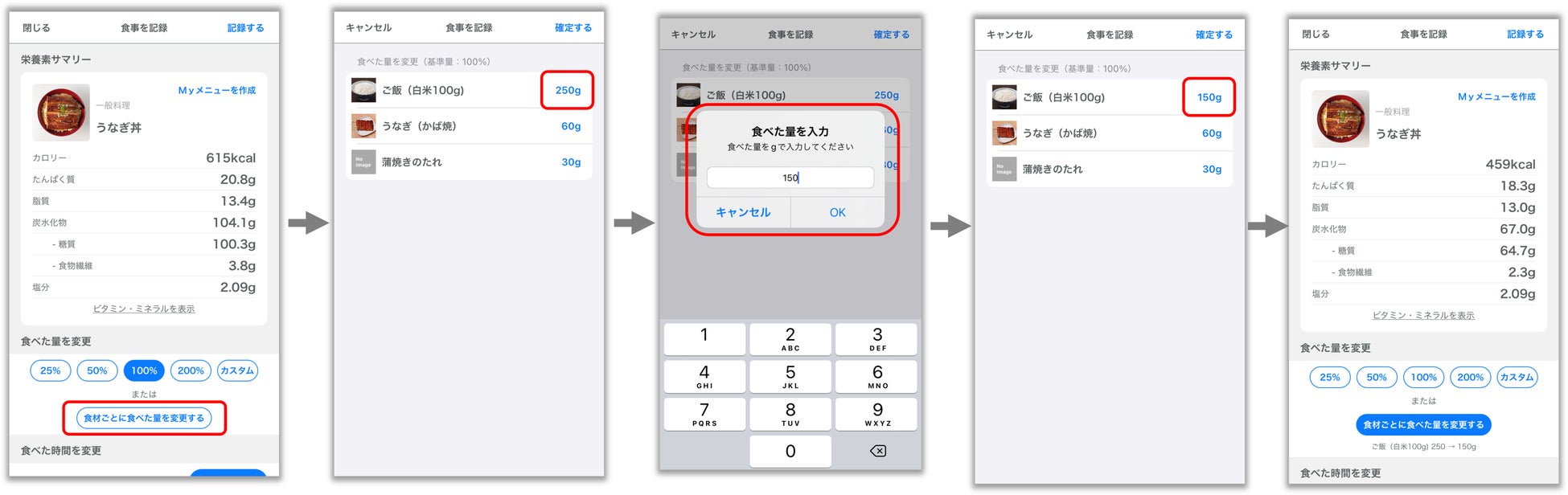 | ①記録したいメニューをタップすると「栄養素サマリー」が表示されるので、「食材ごとに食べた量を変更する」をタップ。 ②調整したい食材のグラム数をタップ。 ③「食べた量を入力」と表示されるので、実際に食べた量をグラムで入力(食べなかった場合は0と入力する)。 ④グラム数が変更されるので、「確定する」をタップ。 ⑤最後に「記録する」をタップ。 |