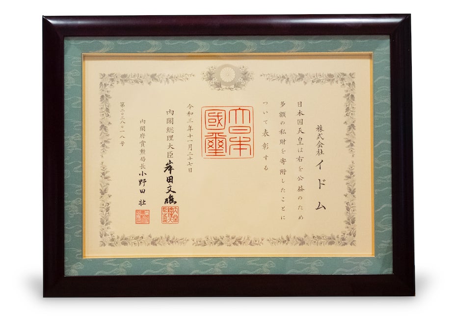 日本政府よりIDOMへ、紺綬褒章に係る褒状の授与に関するお知らせ