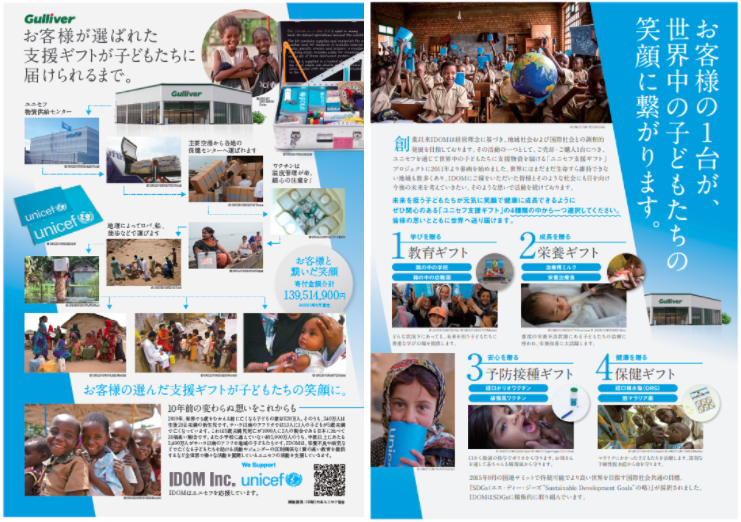 この度、褒状を受章した「ユニセフ支援ギフト」活動は、「地域のお客様と私たち社員が一体となり、1台のご購入・ご売却を支援につなげる」という社員たちの想いのもと、2011年より開始いたしました。以降、車両の購入・売却代金の一部を社会貢献に役立てることができるプランとして全店で導入しております。