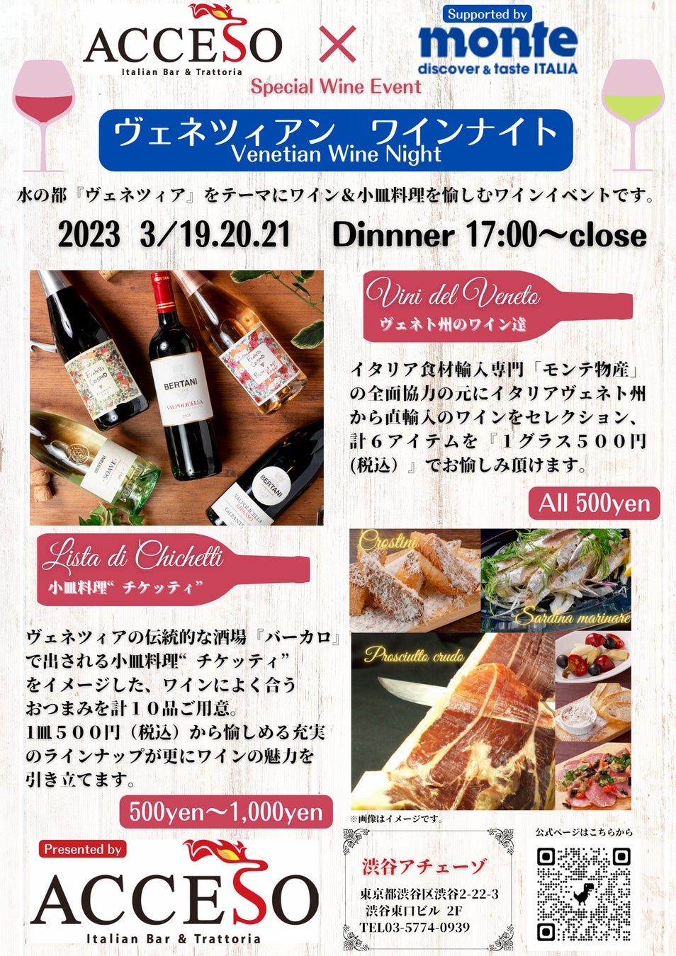 フェスタ ヴェネツィア!水の都ヴェネツィアを有するヴェネト州のワインとイタリアの小皿料理「チケッティ」を愉しむ春のワインイベント【ヴェネツィアン ワインナイト】を『渋谷アチェーゾ』で開催