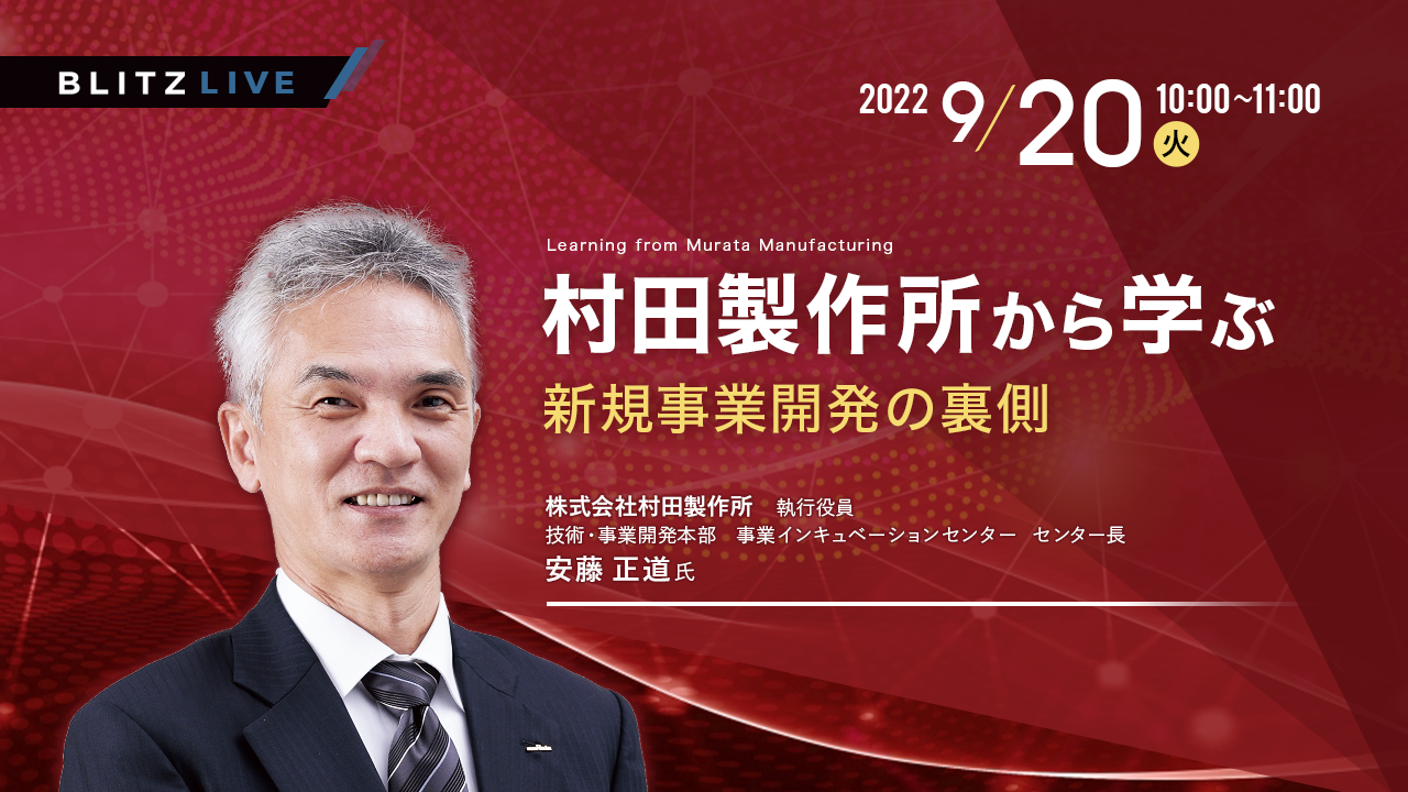 今回のBLITZ LIVEでは、村田製作所の新規事業を牽引する、同社執行役員 技術・事業開発本部 事業インキュベーションセンター長 安藤 正道 氏に登壇いただき、村田製作所のイノベーションの取り組みについてお話いただきます。