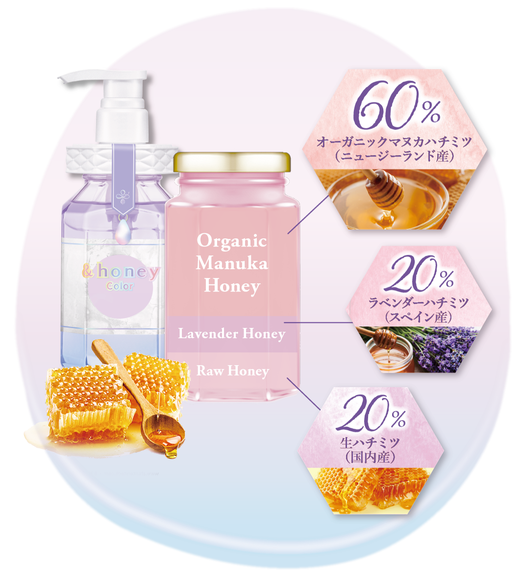 &honey独自のハチミツ美容とカラーケア成分*2の融合により、鮮やかな髪色をキープしながら、キューティクルケアを叶えます。