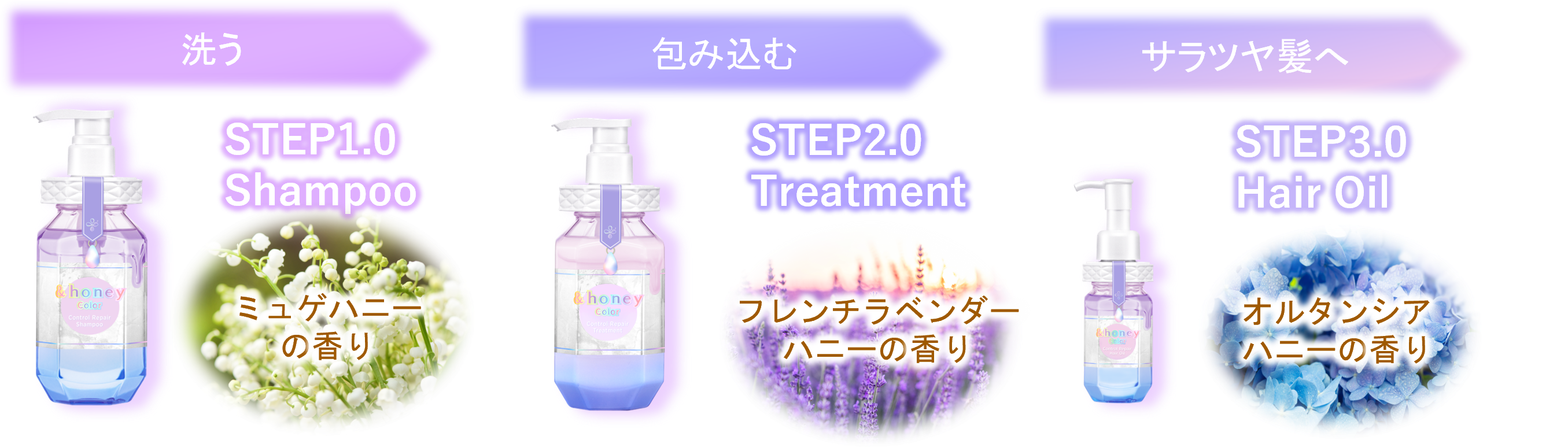 シャンプーはフランス産スズラン*9を使用したミュゲハニー、ヘアトリートメントはフランス産ラベンダー*10を使用したフレンチラベンダーハニーの香り、ヘアオイルは国内産アジサイ*11を使用したオルタンシアハニーの香りを採用。上品で華やかなフローラルが重なる香りをアイテムごとにお楽しみいただけます。