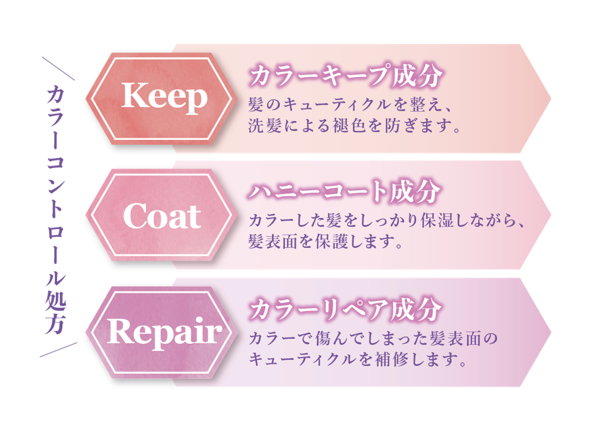 ヘアカラーを繰り返す髪にうるおいを与え、カラーコントロール処方により染めたての髪色をキープしサラツヤの仕上がりに導きます。