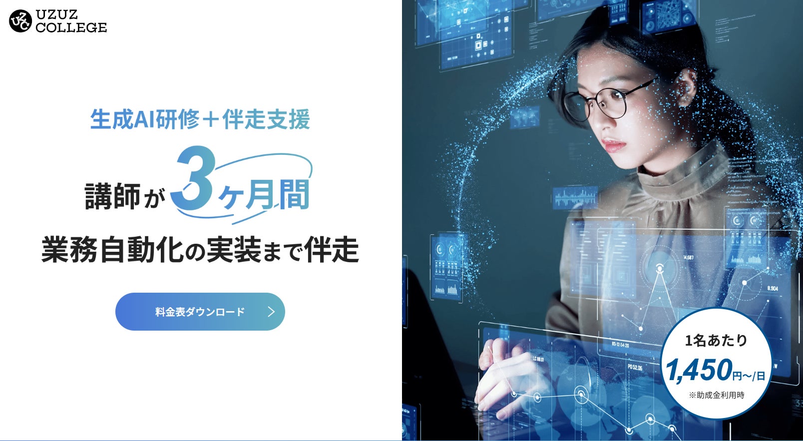 IT/DX分野の教育研修事業、リスキリング支援事業を展開する株式会社UZUZ COLLEGE(ウズウズカレッジ)https://uzuz-college.jp/[本社:東京都新宿区、代表取締役社長:川畑 翔太郎]はこのたび、業務自動化の「学習」と「実装」まで完結できる法人向け生成AI研修サービス「ウズカレBiz AI人材育成コース」の提供を開始いたしました。圧倒的な業務効率化に向けて、生成AIを実務で活かせる人材を最短で育成するための研修プログラムとなっています。
