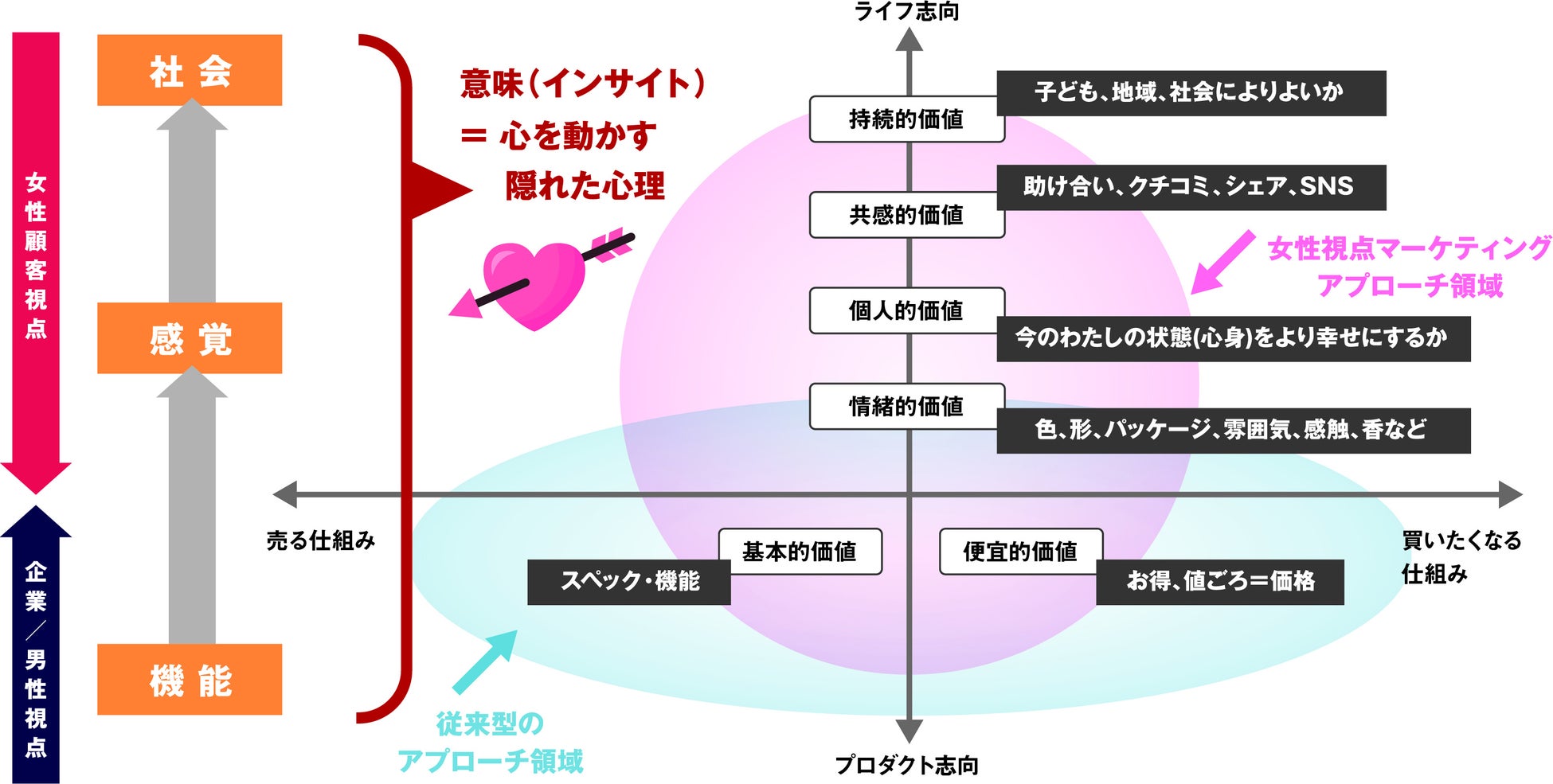 背景には、男性はスペックや優位性を重視、女性は感情価値・情緒的価値を重視する行動傾向があることが読み取れます。