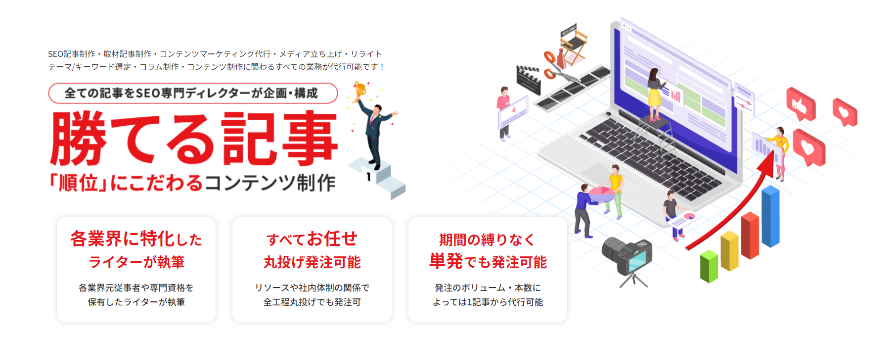 ・SEO記事に限らず取材記事や企画連載記事、著名人を起用した記事など様々なコンテンツ制作が可能です。