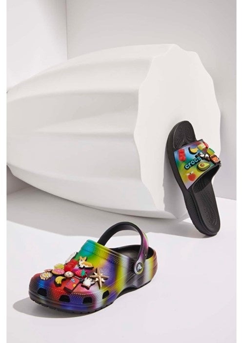 ブラックの「クラシック クロックス ソーラライズド スライド」は、サイバーカラーが目を引く大胆なグラフィックデザインで、自分らしさを表現することにオープンなZ世代の感性を表現しています。Y2K時代のノスタルジーを感じさせる、トレンドのワードローブに欠かせないアイテムです。