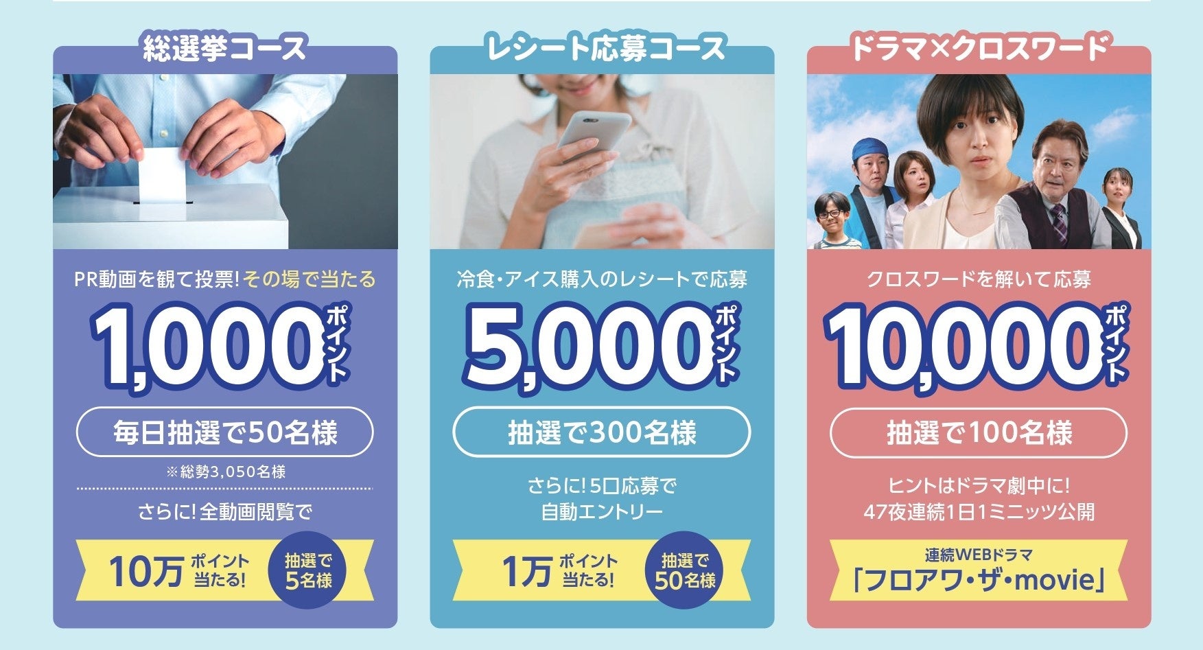スーパーやドラッグストア、コンビニエンスストアなど店頭で販売されている冷凍食品・アイスクリームを含む購入レシートで、抽選で300名様に5,000ポイント/50名様に1万ポイントが当たるキャンペーンです。