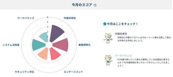 PC作業の可視化だけではなく、従業員ごとの業務負荷や周囲とのコミュニケーション度を総合的に見て従業員の働き方の満足度を定量的に可視化します。人的なリソースが重要視される中、プライベート時間をしっかり確保できているか、業務負荷でオーバーワークになっていないか把握することで長く働き続ける職場を実現できます。