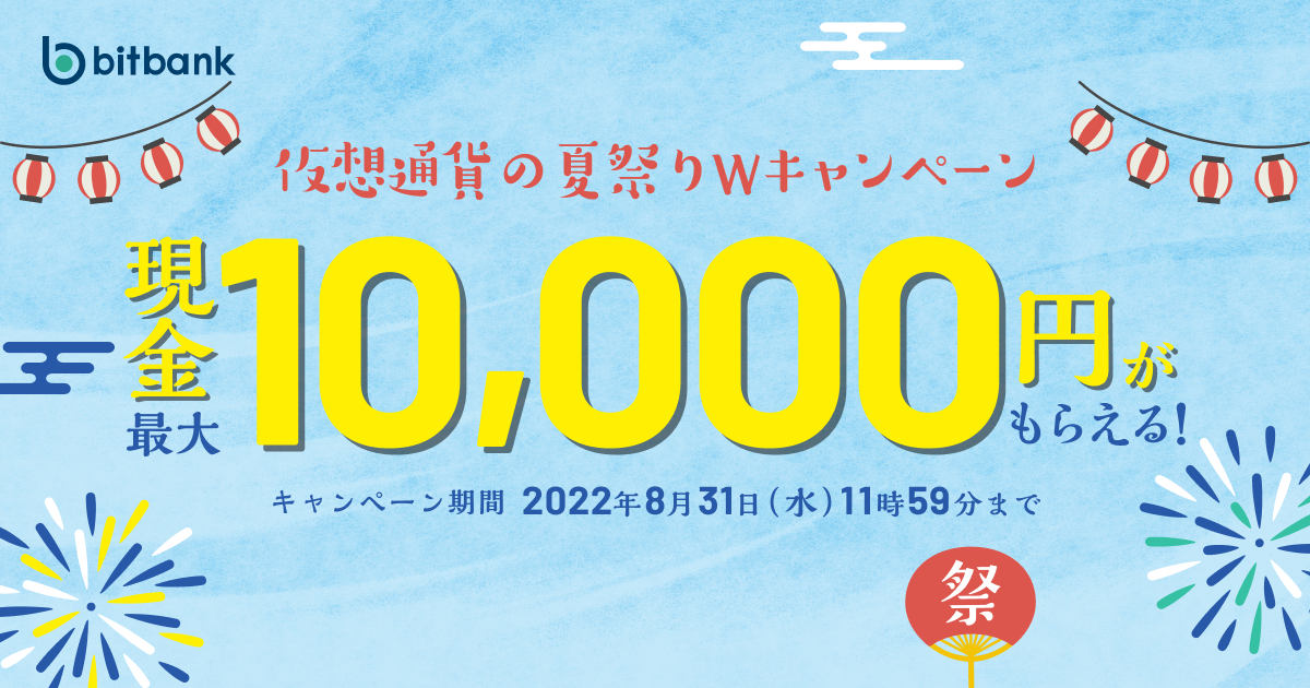ビットバンク株式会社(本社:東京都品川区、代表取締役社長:廣末紀之、以下「ビットバンク」)では、皆様の日頃のご愛顧に感謝をこめて、2022年7月15日(金)〜2022年8月31日(水)11時59分まで、「最大10,000円がもらえる!仮想通貨の夏祭りWキャンペーン」を実施いたします。