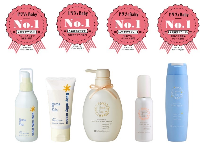 低刺激スキンケアメーカーのナチュラルサイエンス(本社:東京都中央区、代表取締役:小松令以子)では、生後すぐから使える低刺激スキンケア・ボディケアなどを扱う「ママ&キッズ」ブランドの全5アイテム(4部門)が「ゼクシィBaby 育児ブランド クチコミランキング」にてNo.1を受賞しました。