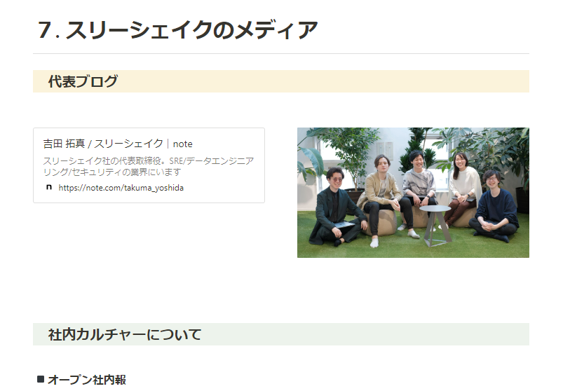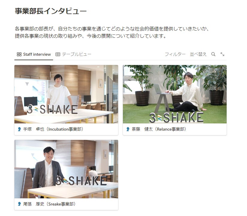 また、スリーシェイクが急速な成長を遂げる中で、求職者に常に最新の会社情報を提供するため、採用サイトにNotionを採用しました。採用サイトを通じて、迅速かつ効果的にスリーシェイクの情報を発信し、求職者の方々とのコミュニケーションを強化してまいります。