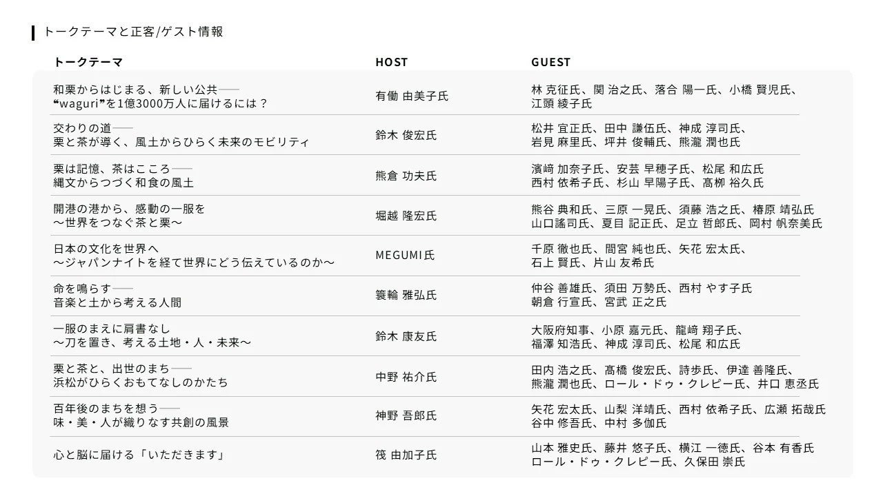 取り組みの一環として開催されました。静岡県遠州地域に根ざす「和栗」と「日本茶」という二つの地域資源を軸に、日本の一次産業が直面する課題や、地域と都市、世代と産業をつなぐこれからの共創のあり方について考える、“文化的な対話の場”として企画されたものです。