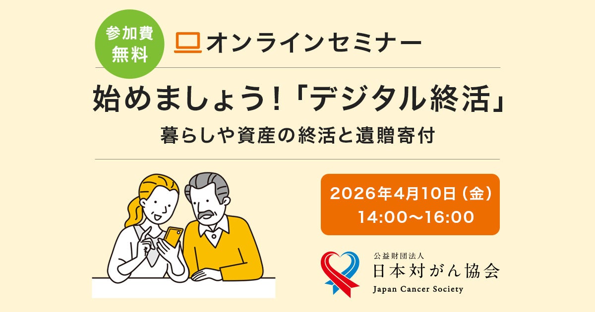 公益財団法人日本対がん協会(東京都中央区築地、会長・垣添忠生)は、オンライン終活セミナー「始めましょう デジタル終活~暮らしや資産の終活と遺贈寄付~」を、2026年4月10日(金)に開催します。