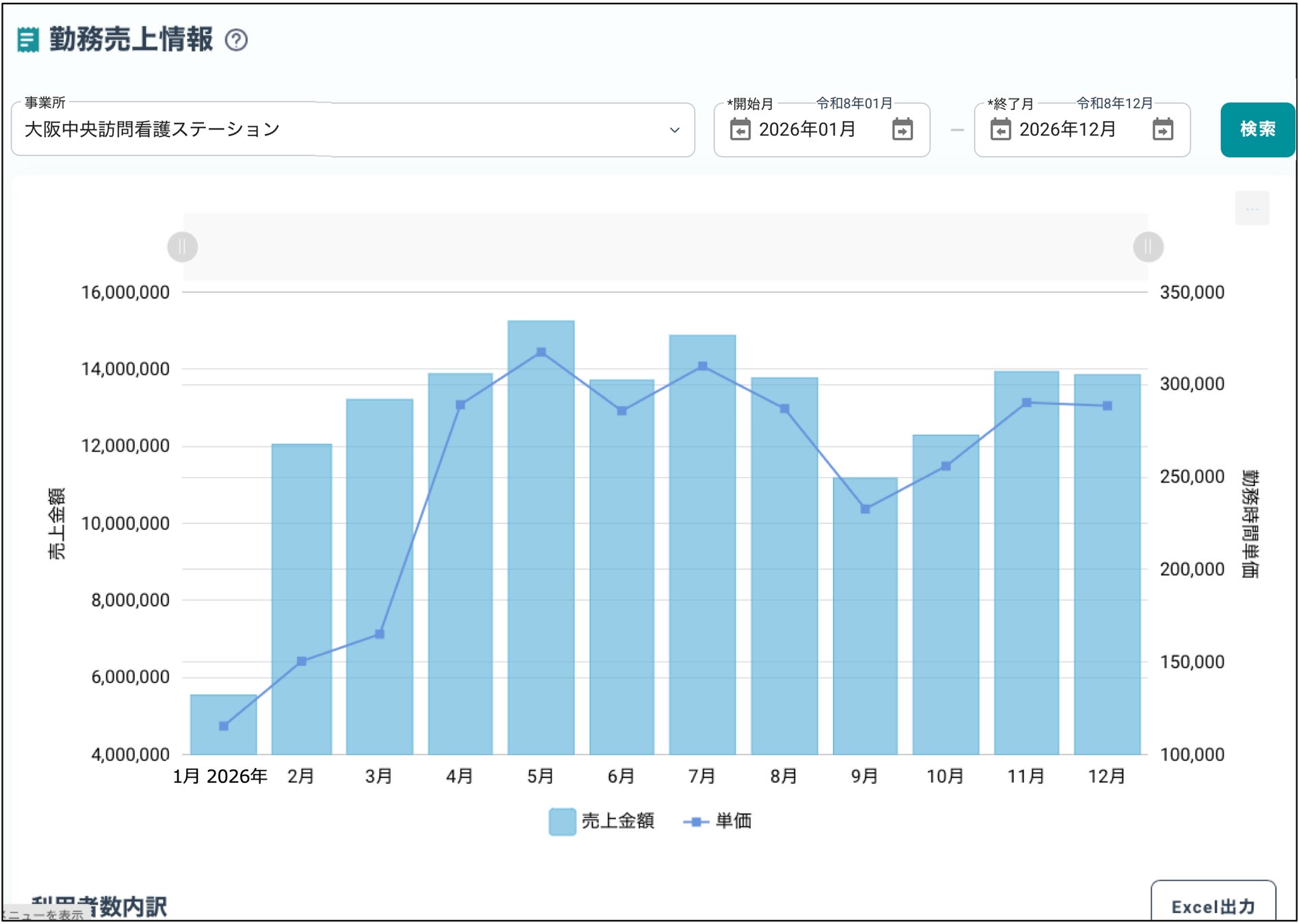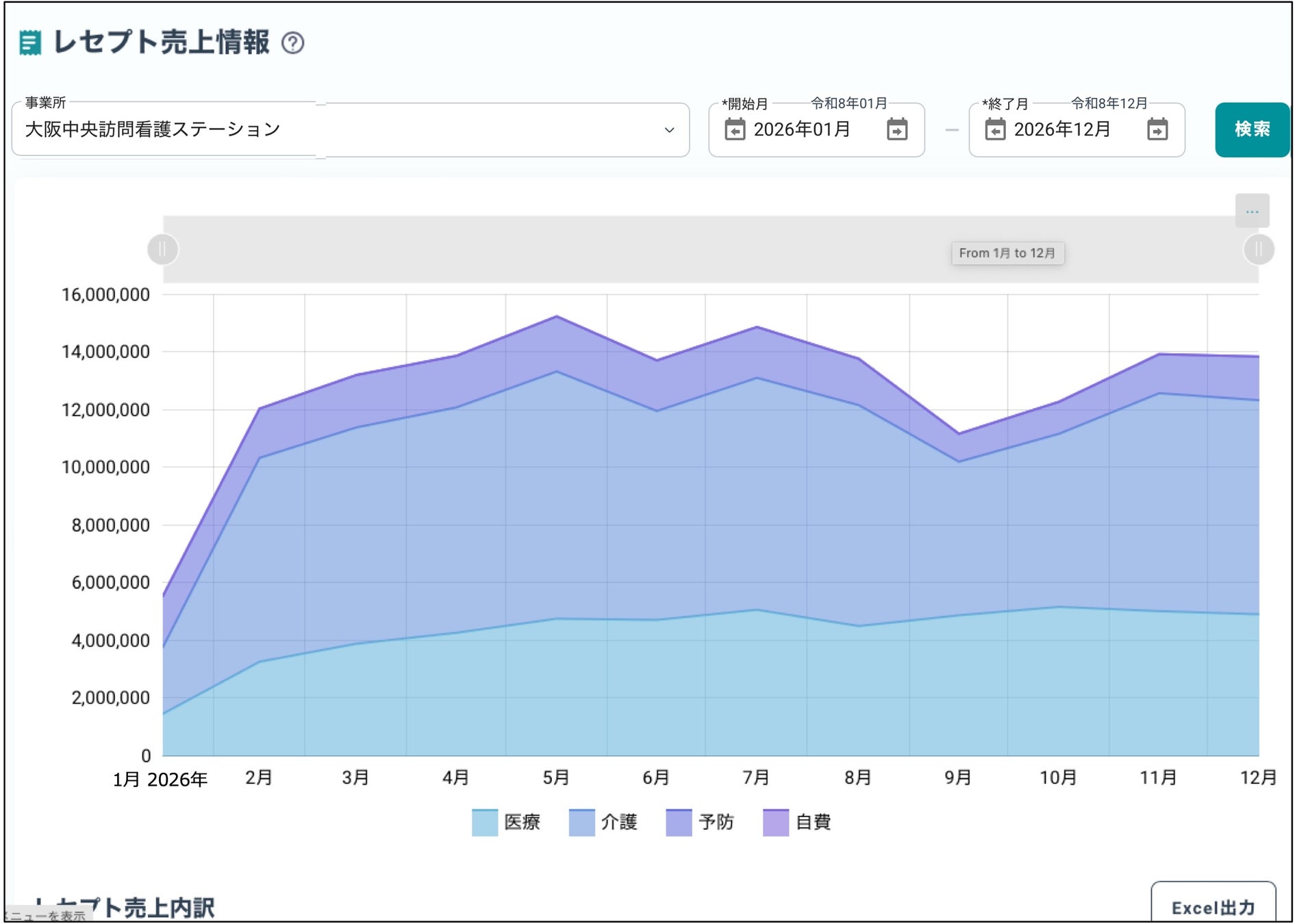 訪問記録件数 / レセプト売上:サービス別(医療・介護)の構成比を一目で把握し、収益構造の変化を特定。
