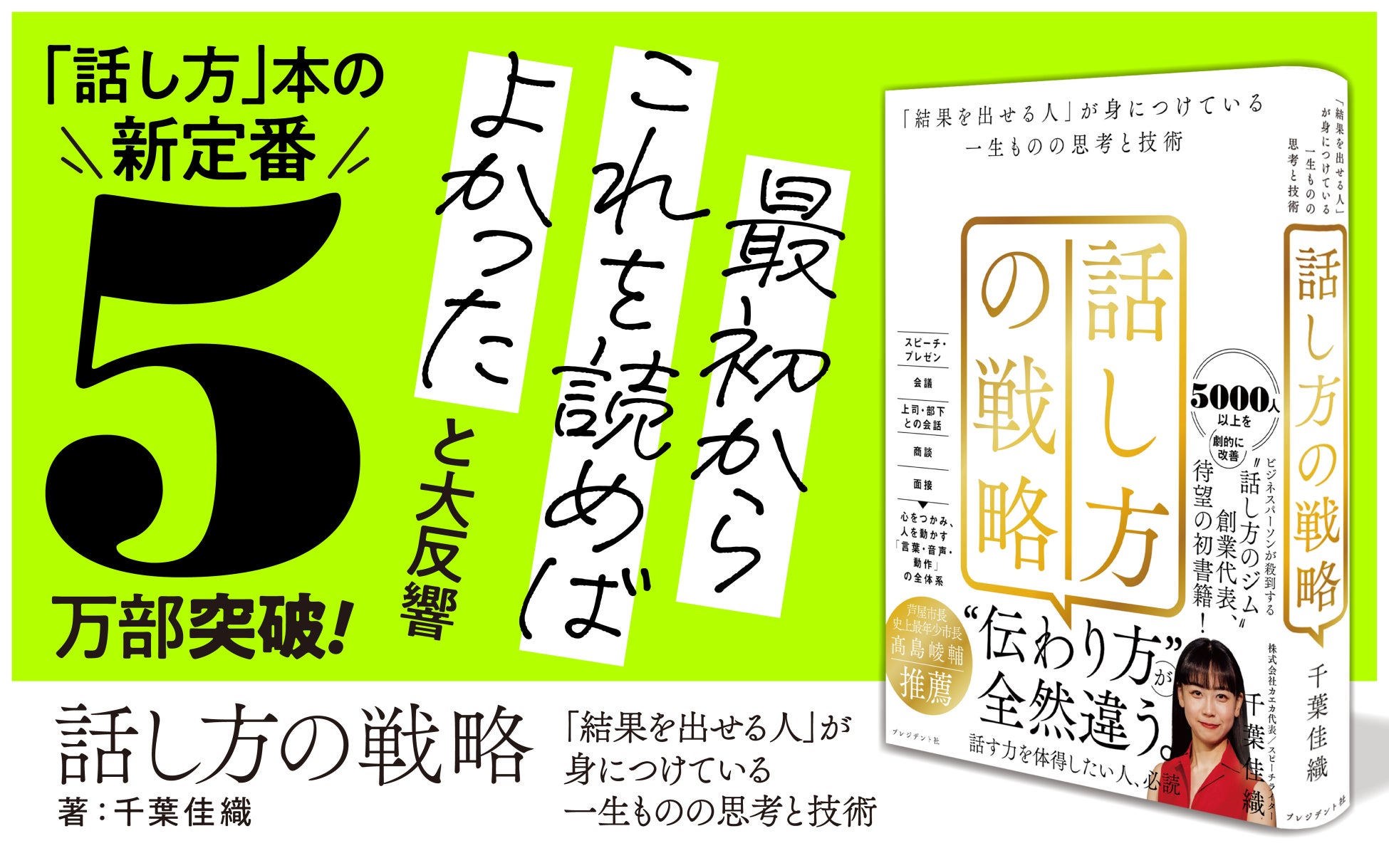 株式会社プレジデント社(本社:東京都千代田区、代表取締役社長:鈴木勝彦)は、株式会社カエカ創業代表・千葉佳織さんの初の著書『話し方の戦略 「結果を出せる人」が身につけている一生ものの思考と技術』が、紙版・電子版を合わせて発行部数5万部を突破したことをお知らせいたします。