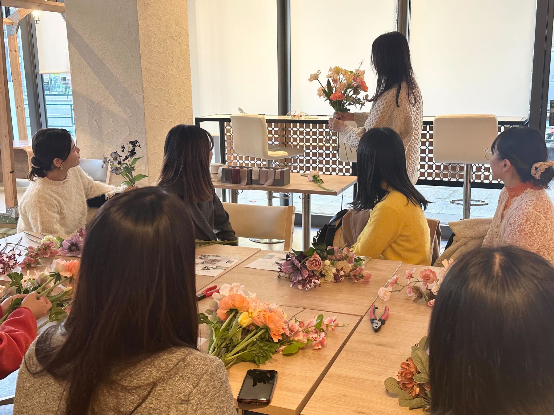 結婚式を控える花嫁とオンライン参加者20名が参加し、結婚式のテーマを考えるコンセプトメイク講座や、前撮りや結婚式当日に使えるアーティフィシャルフラワーブーケ作りを体験しました
