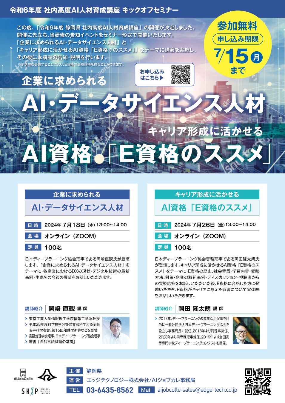 静岡県内企業に向けた「企業に求められるDX人材」(東京工業大学情報理工学院情報工学系教授:岡崎直観氏)と「キャリア形成に活かせるE資格のススメ」(日本ディープラーニング協会専務理事:岡田隆太朗氏)と題したキックオフセミナーを提供(無料・静岡県内企業所属の方は自由参加)。