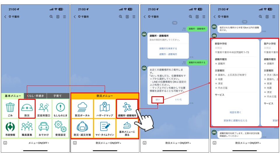今回のリニューアルでは「避難所検索機能」を導入しています。画面の流れに沿って自身の位置情報を送信すると、近くの避難所施設一覧を検索することができます。普段から近くの避難所を確認しておき、いざとなった際にも安心して行動することが可能です。