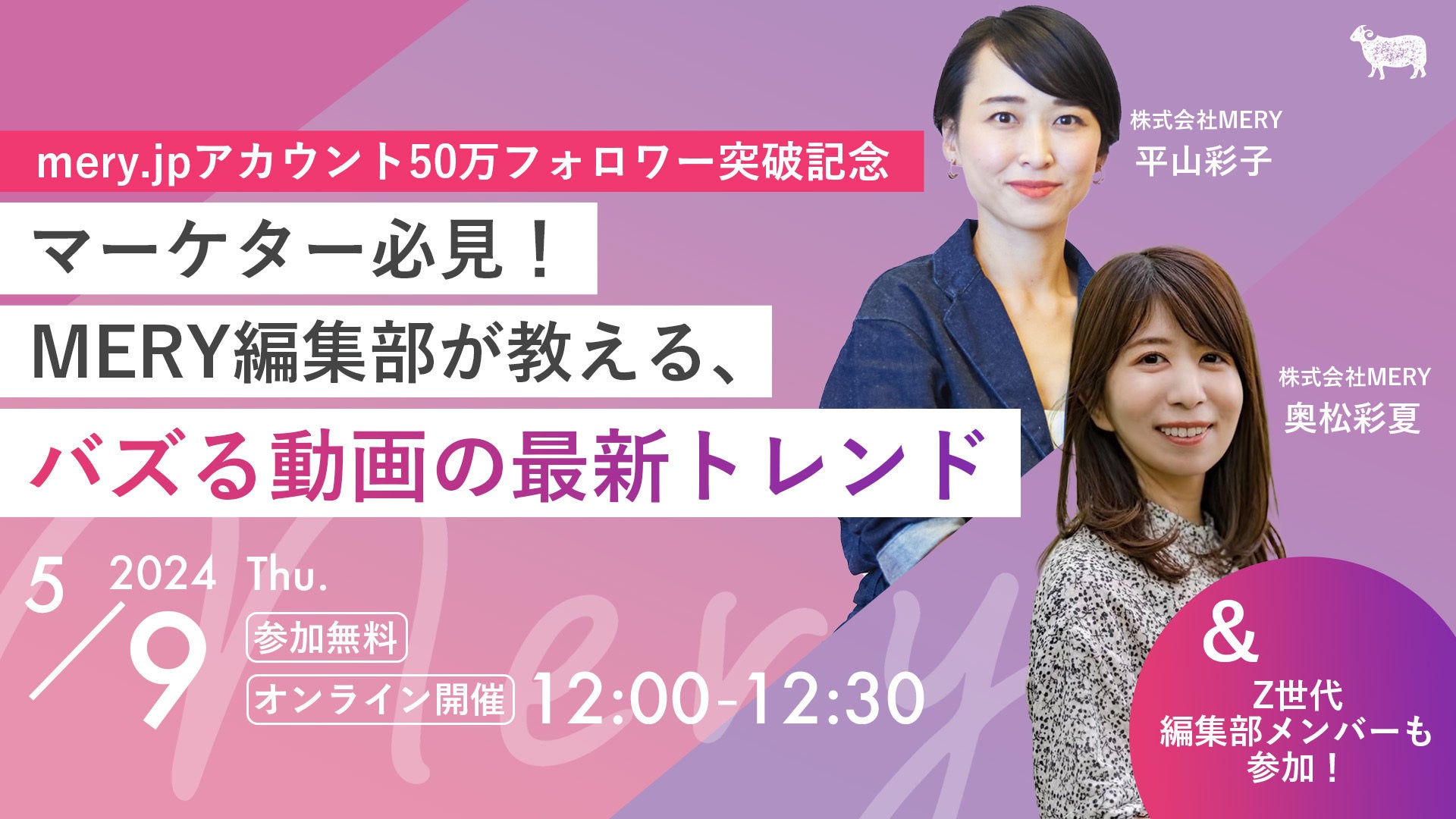 また、企業のマーケティング担当者向けに「~mery.jpアカウント50万フォロワー突破記念~マーケター必見!MERY編集部が教える、バズる動画の最新トレンド」と題したウェビナーを開催いたします。