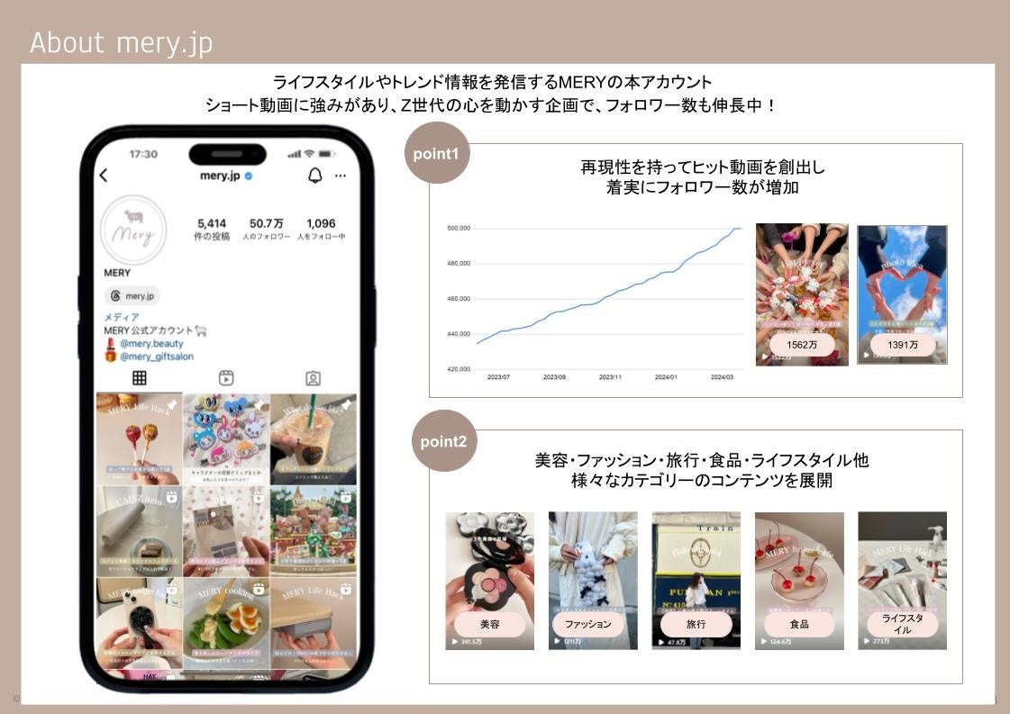 株式会社MERY(本社:東京都千代田区、代表取締役社長:藤田 欣司)は、2024年3月にMERY公式instagram【@mery.jp】が50万フォロワーを突破し、アカウント総計で170万フォロワーを突破したことをお知らせいたします。また、mery.jpの50万フォロワーを記念して、特別プランのリリースおよびマーケティング担当者向けのウェビナーを開催いたします。