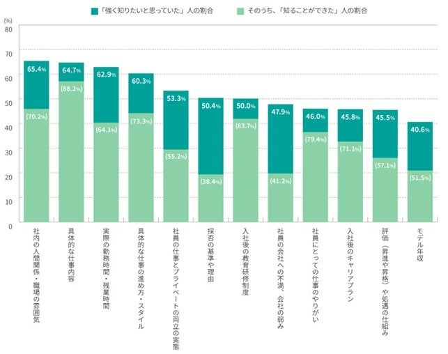 Q 就職活動中に、強く知りたいと思っていた情報を教えてください。そのうち、知ることができた情報を教えてください。(複数選択。()内の数字は、知りたいと思っていた人の中で、知ることができた人の割合)