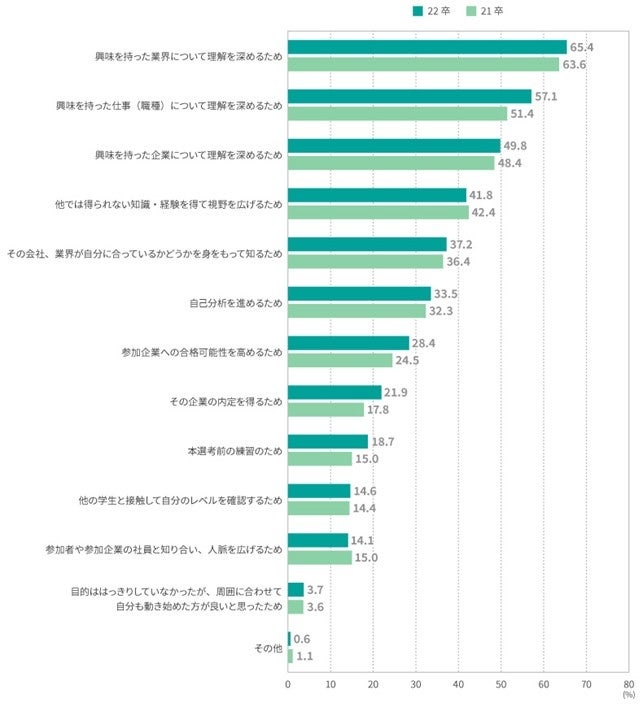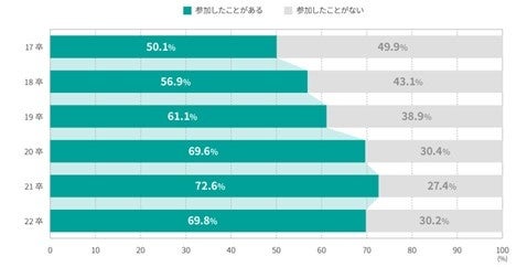 22卒でインターンシップに参加した学生の割合は約70%で、17卒からおよそ20%の上昇。