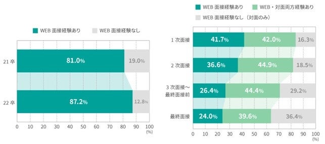 22卒の学生の87.2%がWEB面接を経験しており、最終面接でも63.6%がWEB面接を経験していた。