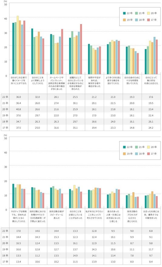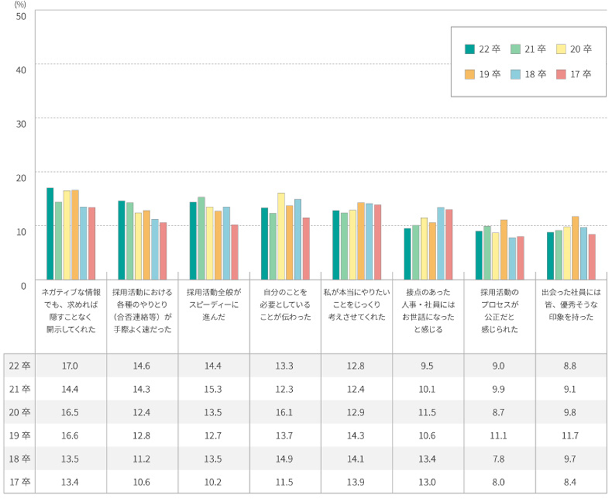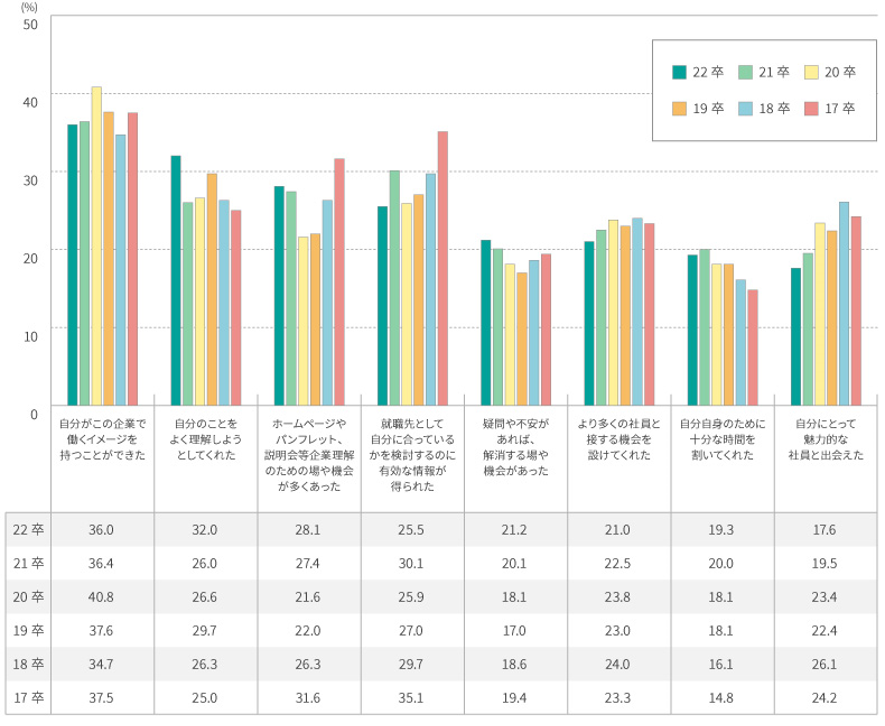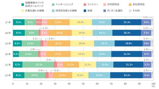 近年では「インターンシップ」の影響が大きくなっているが、依然として1位は「面接」。21卒・22卒では非対面で選考が進むことが多くなったため、社員との接点よりも、決定のための材料や不安解消の場が多い、自分に時間を割いてくれる、選考が速やかに進むという点で、自分が大事にされていると感じられることが重視される傾向が見られた。