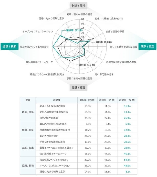 重視したい社風を比較すると、「協調/親和」のカテゴリにある「相互の思いやりとあたたかさ」「オープンなコミュニケーション」の方向へと、徐々にグラフが大きく張り出していっている。