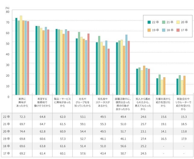 就職活動の手法や響く価値が変化する中でも学生が企業に応募する動機は大きくは変わらず、業界、勤務地、製品・サービスに対する親近感がきっかけとなっている。近年では「知名度やステータス」の選択率が高まる傾向も見られる。