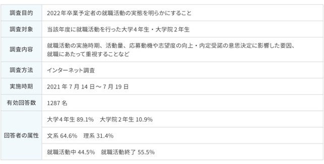 今回調査対象とした2022年卒予定の方々は、大学・大学院時代の大半をコロナ禍で過ごされています。その中での就職活動の進め方や、働くことに対する価値観はどのようなものであったかを知るため、経年での集計・考察を行いました。