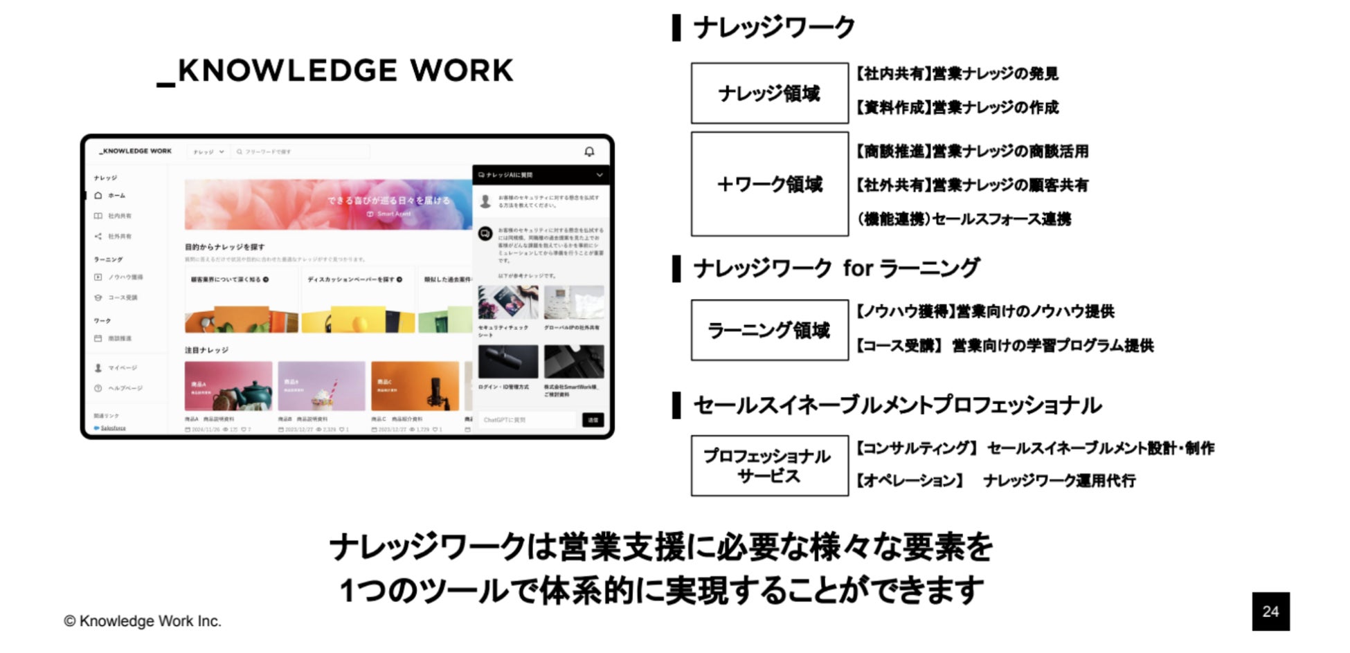 ナレッジワーク社は、大手企業様向けにセールスイネーブルメントAI「ナレッジワーク」を提供しています。これまで、営業資料の発見・共有を支援するナレッジ領域プロダクトや、商談シナリオの作成・資料準備を支援するワーク領域プロダクトを通じて、営業担当者の商談前プロセスを支えてきました。