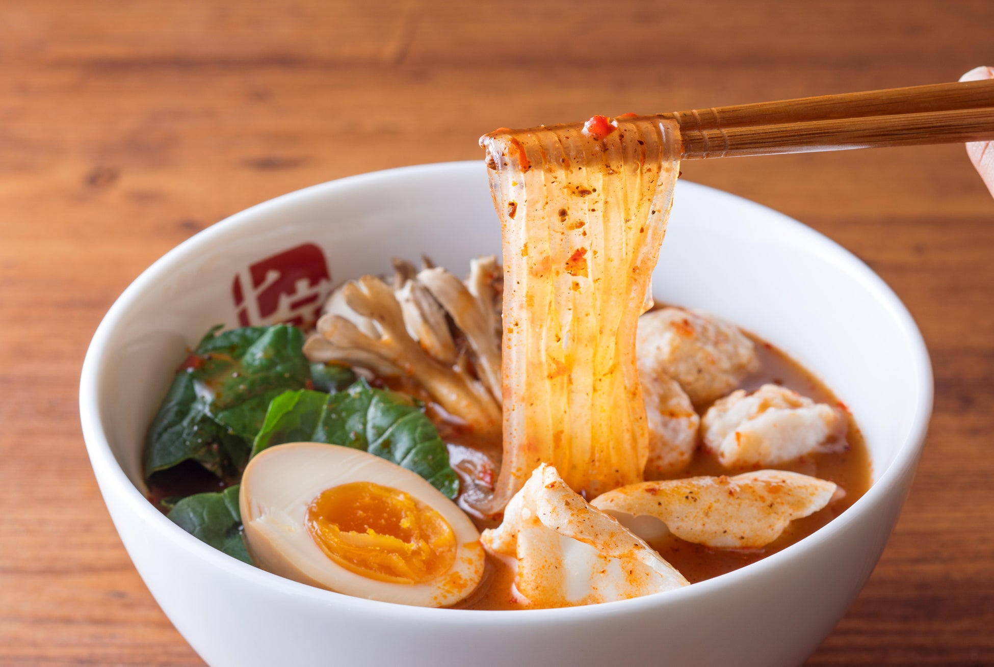 野菜などのトッピングや辛さを自由に選べるスパイシーな薬膳スープ春雨を提供。スープは毎日店舗で炊き上げ、30種類以上の薬膳素材を加え、辛さと旨味と華やかな香りが特徴です。