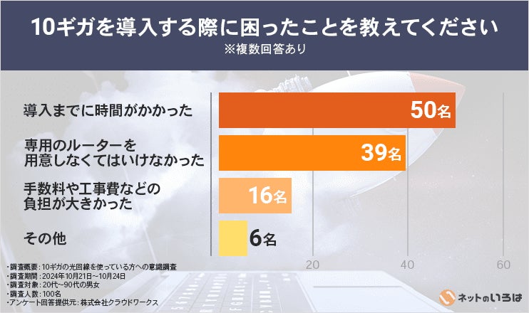 次点では「専用のルーターを用意しなくてはいけなかった」で35%という結果に。事業者によっては10ギガ専用ルーターをレンタルできるケースもあるため、積極的に利用することをおすすめします。